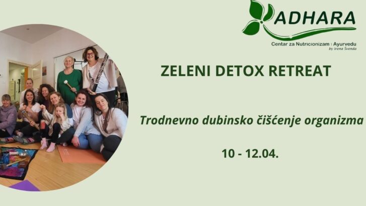 Zeleni detox retreat je trodnevni intenzivni program dubinske detoksikacije organizma kroz post na zelenim sokovima i juhama, terapijsku yogu, tehnike disanja i duboko opuštanje.